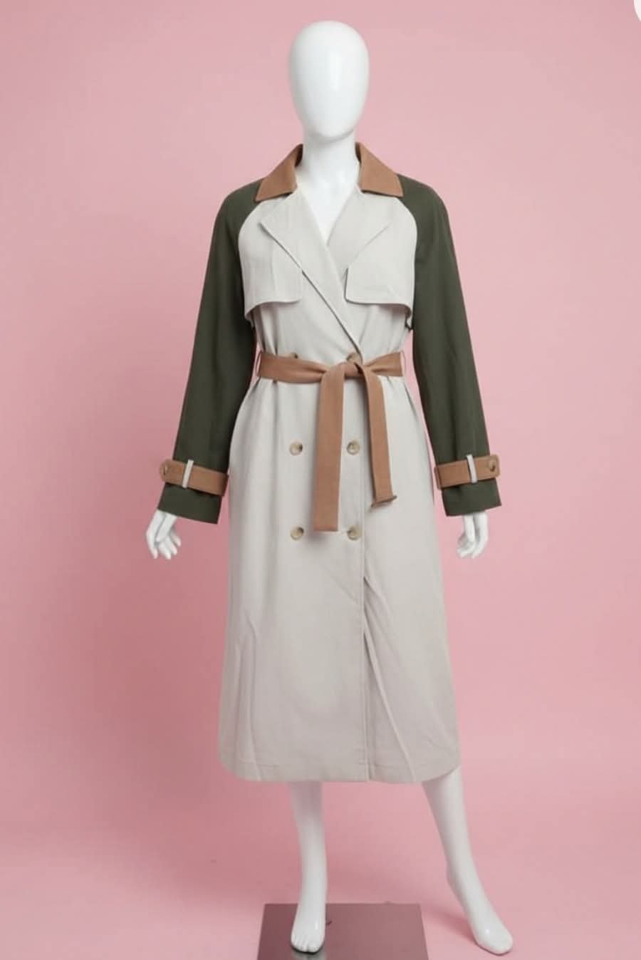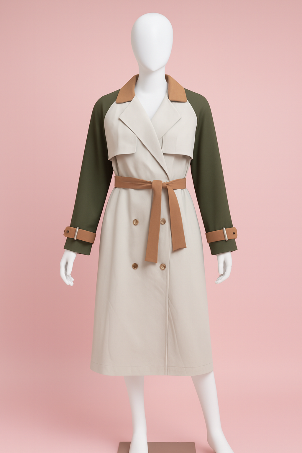 تميّزي بإطلالة فريدة مع هذا المعطف الترنش المصمم بأسلوب بلوك الألوان الجريء. يجمع بين اللون البيج الكلاسيكي للجسم، وأكمام خضراء داكنة، وتفاصيل بنية فاتحة على الياقة والحزام وأشرطة الأكمام، ليمنحك مظهرًا أنيقًا ومميزًا